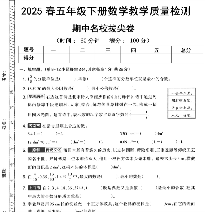 | 资源亮点 | ✅ 紧扣人教版教材,同步最新期中考点! ✅ 5套精选密卷,一键打包下载,省时高效! ✅ 每卷含详细答案与评分标准,查漏补缺精准! ✅ 封面版+原卷版双格式可选,老师家长辅导无忧! |