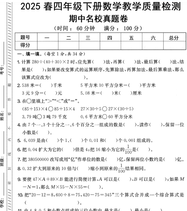 | 【新版期中打包5套】小学四年级下册数学期中考试卷(人教版) – 密卷原题·精准测评·极速获取 | |