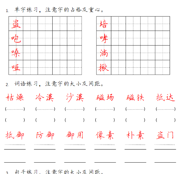 | 内容优势 | 📚 字词积累:每日重点字词注音、释义、组词 📝 句子训练:造句、仿写、病句修改技巧 ✍️ 小练笔:看图写话、日记片段、短文仿写,培养写作思维 🖋️ 规范书写:楷书规范排版,提供描红与临写模板 🎯 假期提分:每天15分钟,轻松避免开学滑坡 |