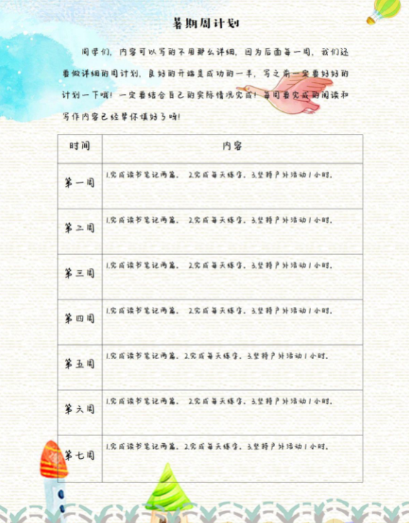 | 内容结构 | 📘暑假每日一练:基础+拔高,巩固知识 🎨创意手工记录:激发想象力与动手能力 📊生活技能打卡:时间管理+自理能力成长 📖课外阅读推荐:书单+读后感模板 |