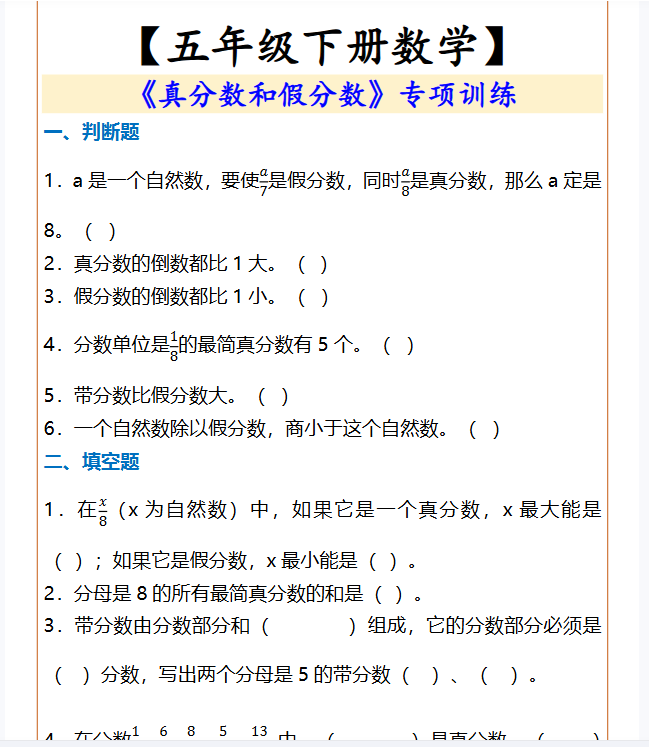 | 资源亮点 | ✅ 5套高清完整版《真假分数》专项训练题(持续更新) ✅ 涵盖最新考纲要点,精准分类:真分数、假分数、带分数互化技巧 ✅ 每份含详细解析与高清原图,可直接一键打印使用! ✅ 来自权威教育机构持续更新资源,题目持续补充中,最新最快获取方式在这里! |