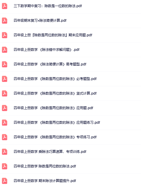 | 资源亮点 | 📚275份精选除法练习与解析,涵盖整数/小数/分数/竖式/应用题全类型! 📖高清无水印完整版PDF,清晰打印、随时翻阅,学习体验满分! 🔄持续动态更新,每日新增精选试题,紧跟教学前沿! 🎯按难度分级编排,适合3-6年级学生及教师备课使用! |