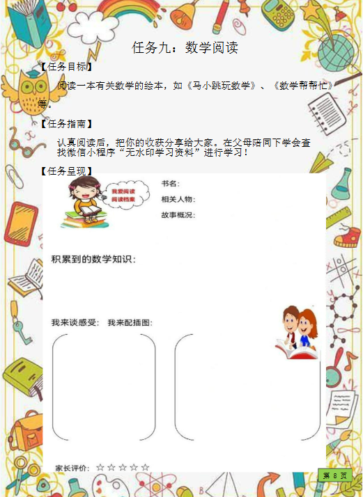 | 作业亮点 | 📘12页完整内容,主题丰富:暑期生活记录+识字拓展+思维训练+手工创意 🖼️高清无水印设计,清晰打印不模糊,保护孩子视力 ✅可直接保存为PDF,一键打印,省时省力家长首选 🎨趣味图文结合,动手又动脑,激发一年级学生兴趣 |
