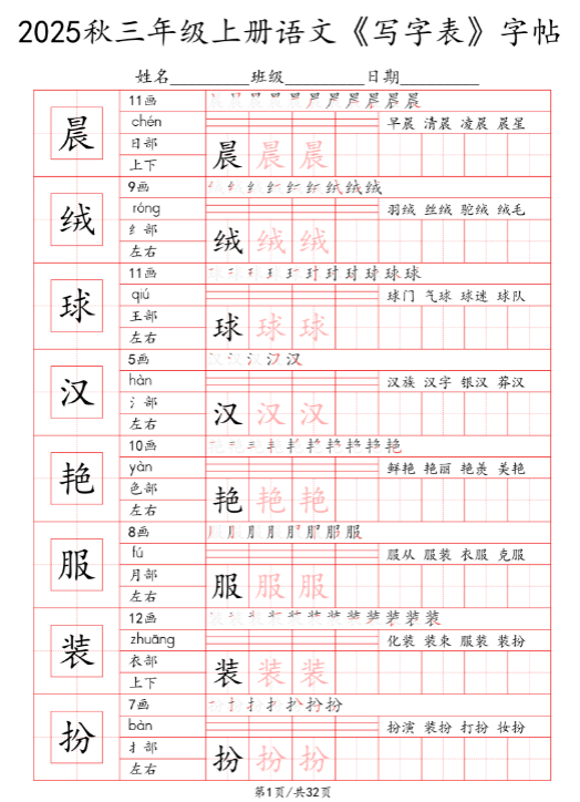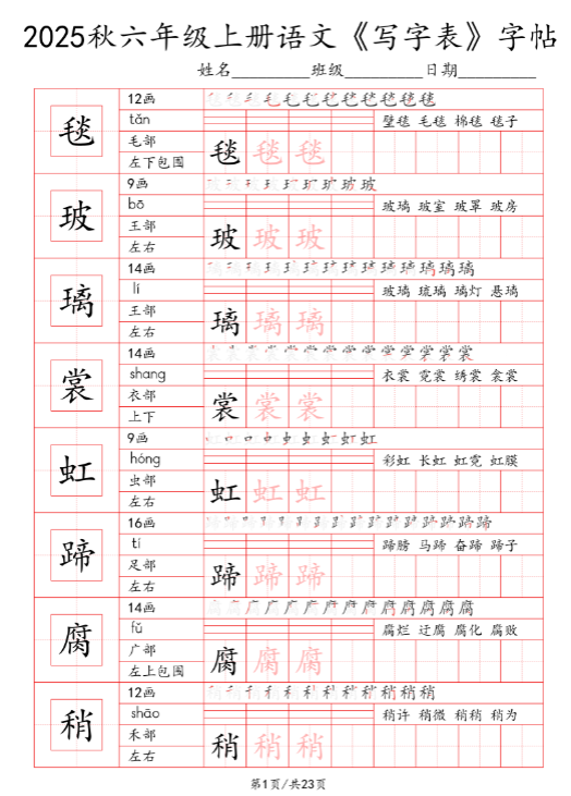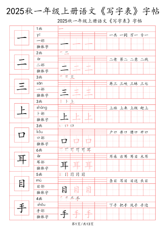 | 2025秋1-6年级《写字表》一类字字帖(高清可打印版) | |