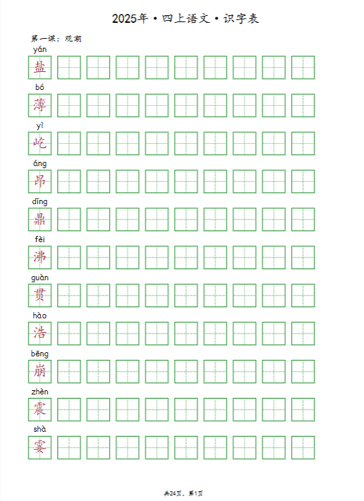 | 一键快速保存!2025秋四上《识字表》《写字表》《词语表》高清完整版,同步教材精准抄写默写模板,小学生高效练字识字必备神器!限时免费下载,掌握书写规范不再难! | |