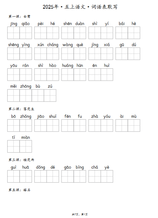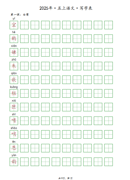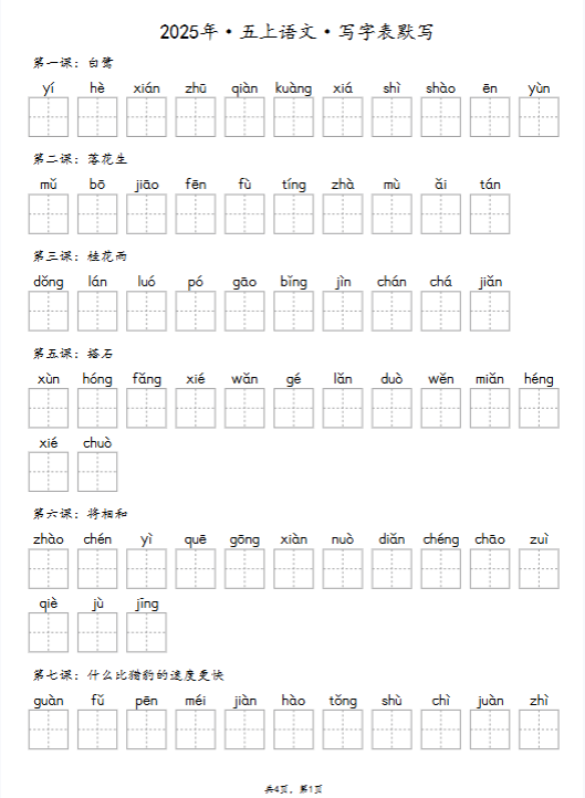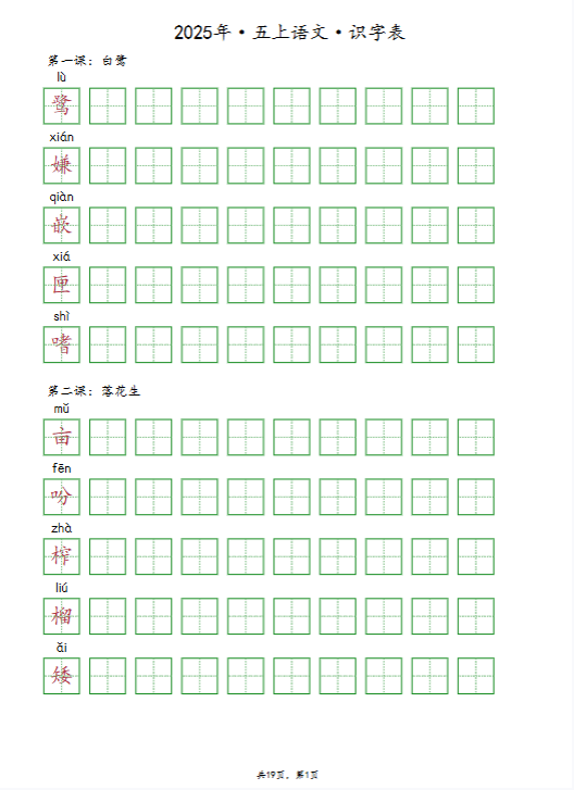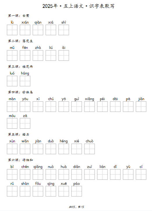 | 2025秋五上语文《识字表》《写字表》《词语表》全套高清同步抄写默写模板(部编版) | |