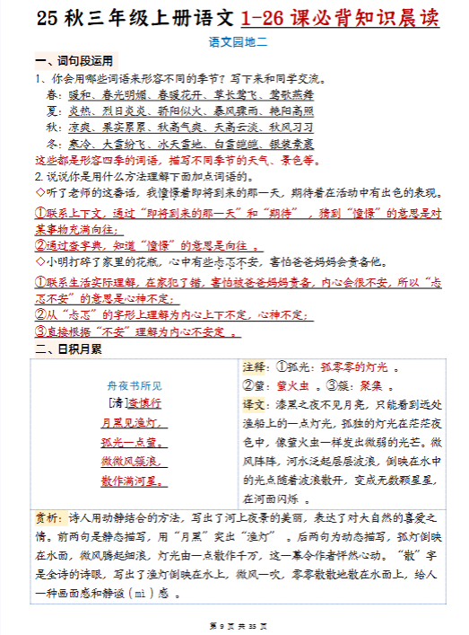 2025秋三年级上册语文1-26课必背知识晨读单(35页)