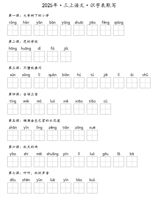 【立即一键下载】2025秋三上语文全表合集,打印即练,默写满分轻松拿!