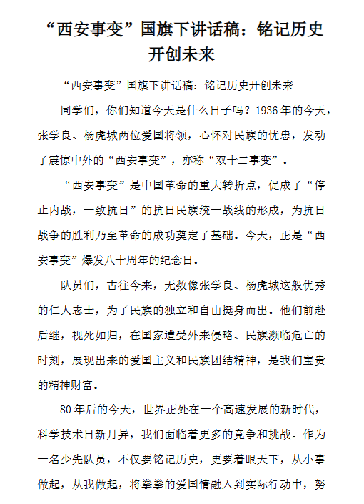 | 一键快速保存,西安事变国旗下讲话高清精讲版全文可编辑!最新整理权威内容,一键打包下载即得完整演讲稿+历史背景分析,助你深度领悟爱国精神!错过再无,快点击获取这份热血教育素材! | |