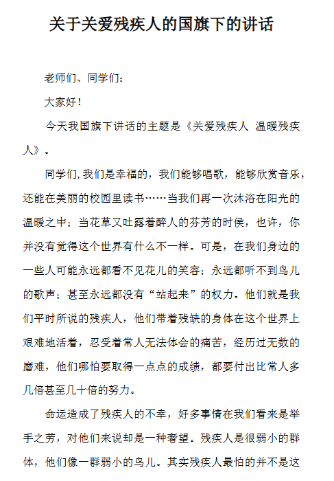 | 【立即一键保存】4份关爱残疾国旗下讲话模板高清编辑版,免费快速下载,助力校园温暖传播! | |