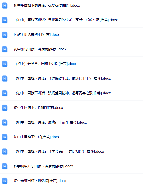 | 一键快速保存,72份初中国旗下讲话最新整理版高清可编辑打包!涵盖开学/爱国/成长等全主题,班主任备课神器,Word一键编辑修改,直接下载即用! | |