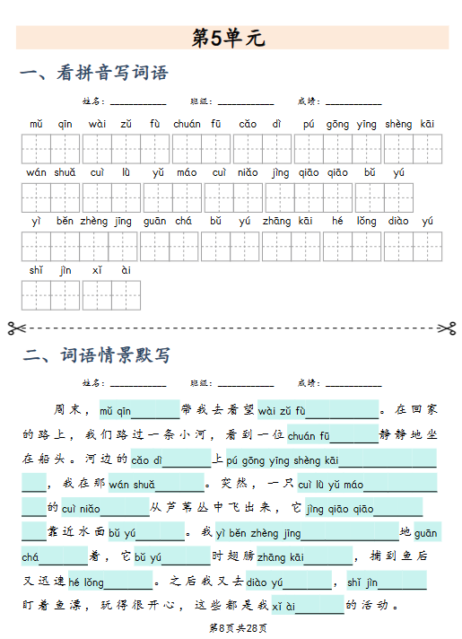 | 核心特色 | ✅ 全新2025秋季教材同步更新,紧扣教学考纲变化 ✅ 150+高频词语情境填空题,真实考试题型演练 ✅ 彩色图文版+黑白打印版,双格式一键下载任选 ✅ 答案附详细解析,扫码核对秒查错 |