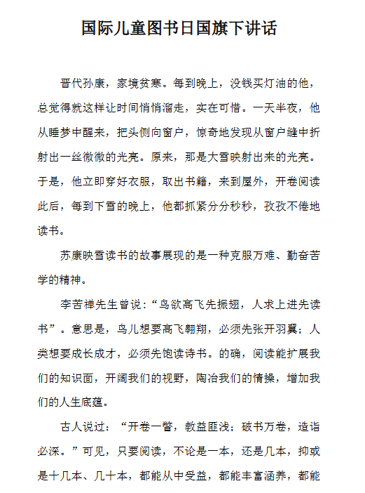 | 一键保存儿童图书日国旗下讲话最新整理版!高清完整打包下载,3份演讲稿精编版本直接获取,编辑修改超便捷,教育孩子必备用!立即点击极速下载,助力校园主题活动完美开展! | |