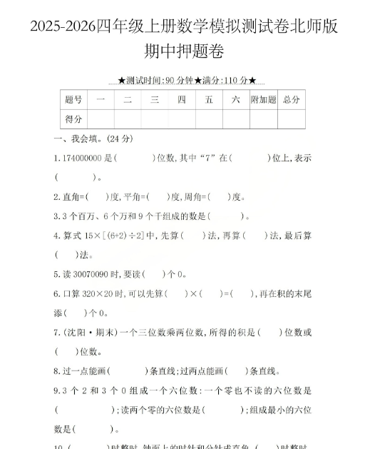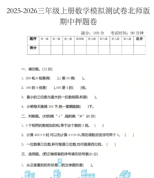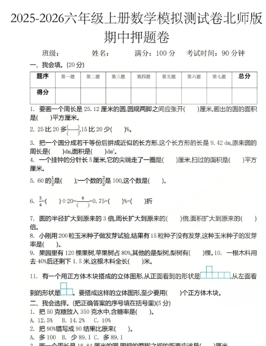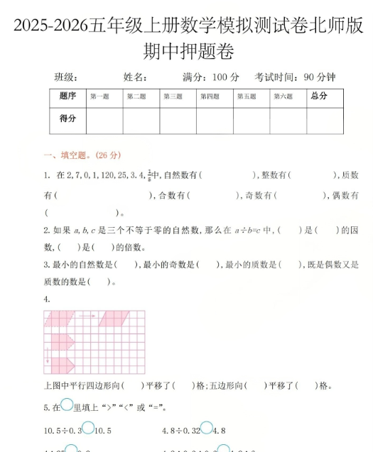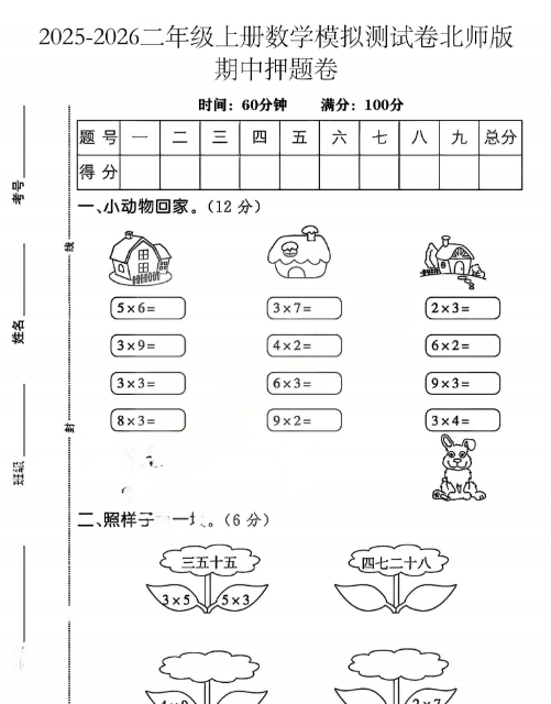 | 北师版1-6年级期中卷打包整理(高清可打印版) | |
