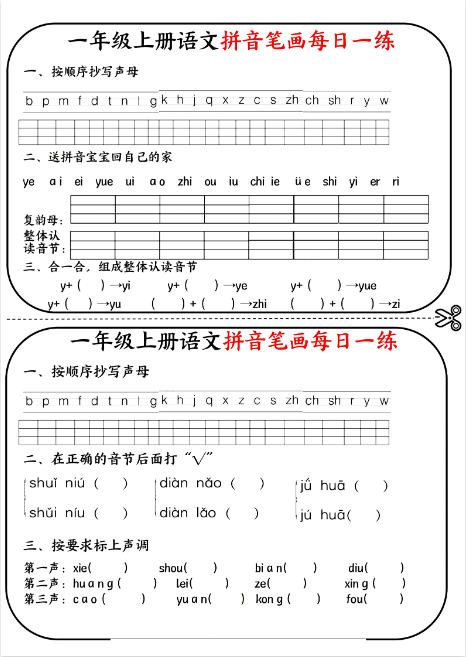 | 一年级上册语文《拼音笔画每日一练》完整高清练习册 – 一键下载,立即打印开练! | |