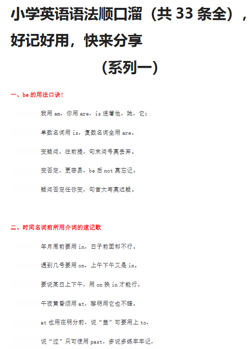 | 【10页新版】小升初复习:小学英语语法顺口溜(共33条全)——学霸都在偷偷刷的提分神器! | |