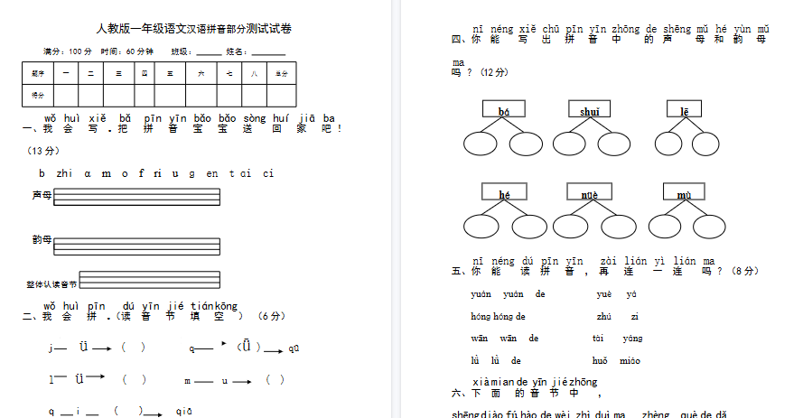 | 资源亮点 | 📄完整3页高清PDF格式,支持一键打印! 🔍覆盖声母、韵母、拼读规则等核心考点 ✅题型多样:填空、连线、选词、纠错等 🖨️可直接打印成纸质试卷或作业本! |