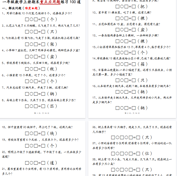 | 【34页完整版】一上数学期末重点应用题【期末高清版可直接打印】 | |