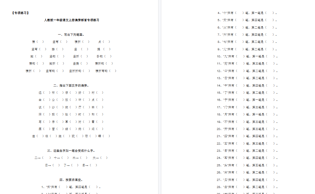 | 【4页完整版】偏旁部首专项练习【高清直接可打印】 | |