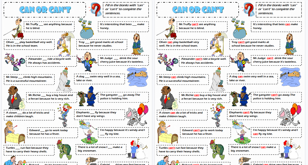 | 【2页完整高清彩色版】Expressing ability or inability|can or can’t 语法练习作业纸(63套 可直接打印) | |