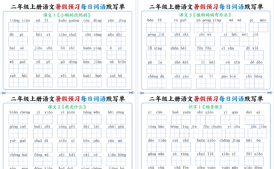 | ✨一键快速保存,抢先领取!【8页完整版】二(上)语文暑假预习每日词语默写单(1-4单元),高清无水印PDF即刻下载,暑期逆袭就这么简单!📚速存备考,高效预习立见效! | |