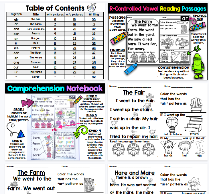 | 【40页高清彩色版】Controlled Vowel阅读理解丨完整可直接打印的自然拼读小短文练习纸 | |