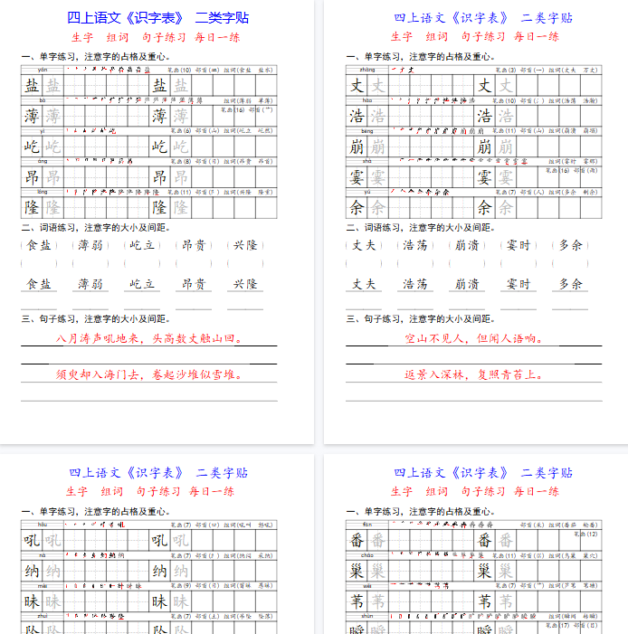| 【54页完整版】四(上)语文二类字每日一练-生字组词句子练习(可打印版) | |