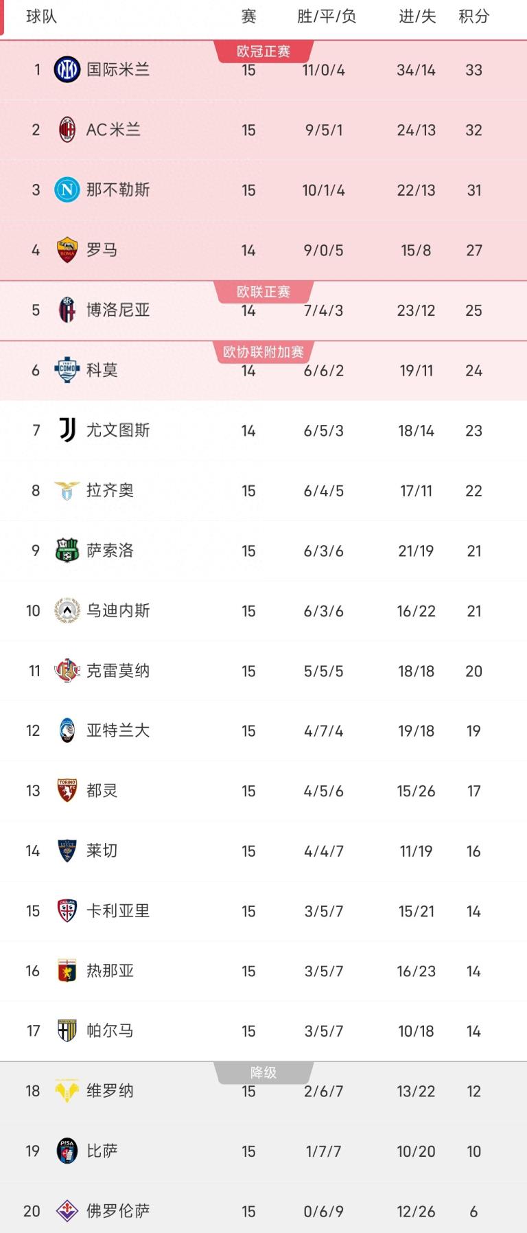 以上就是本赛季意甲第15轮后的积分榜及赛况情况,可以看出比赛结果直接影响球队排名,争冠和保级都充满变数。