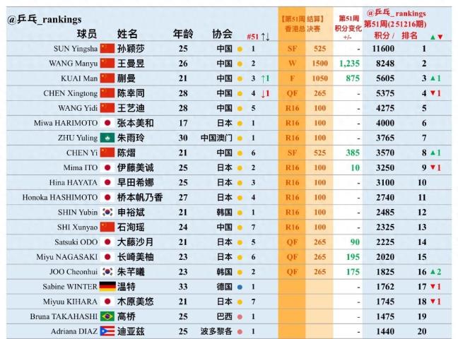 | 陈熠 | 上升1位 | 3570分 | 半决赛进线,击败朱雨玲、陈幸同 |