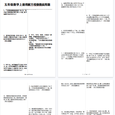 | 一键极速保存!五年级数学上册解方程倍数应用题14页完整高清版,精准解析+举一反三,期末冲刺必备神器,点击立即免费下载,拿高分就这么简单! | |