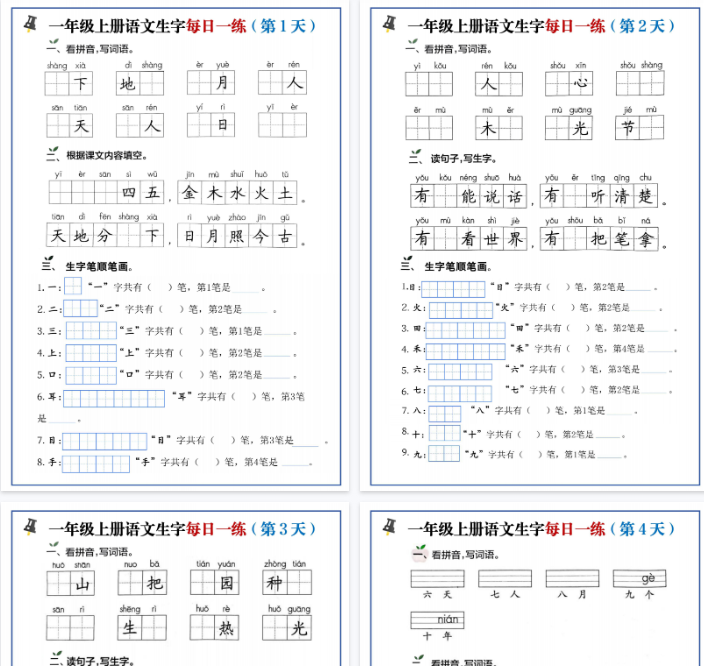 | 高清10页整理 | 一年级(上)语文生字每日一练(完整版可打印) | |
